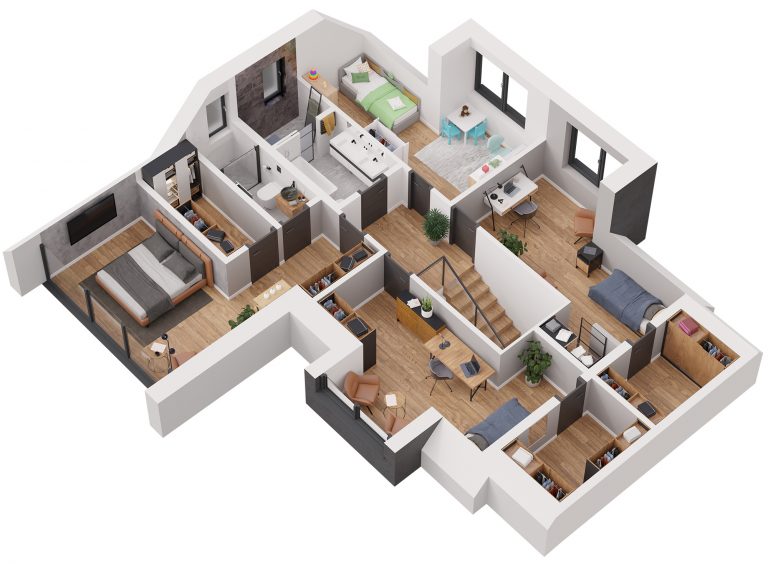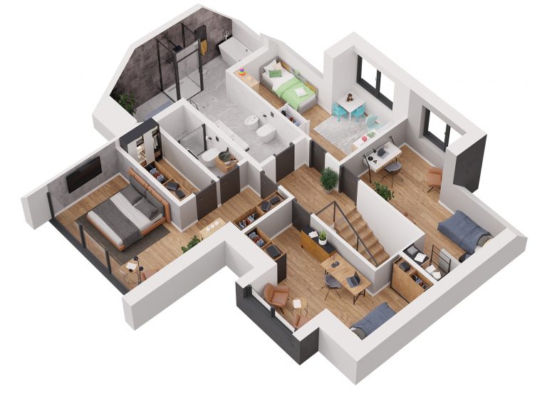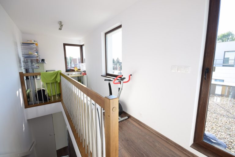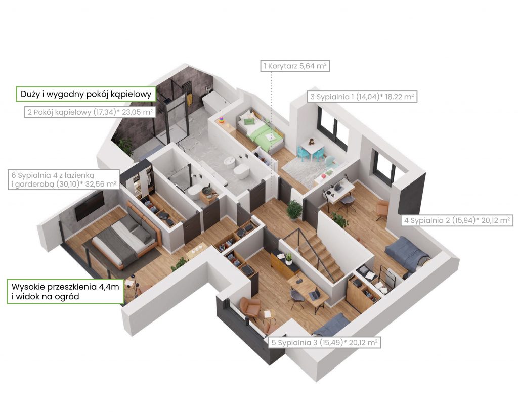 Na piętrze czekają na Ciebie cztery przestronne sypialnie. Główna o powierzchni ponad 32 m², z indywidualną łazienką oraz garderobą, ma wysokość aż 4,5 metra (przeszklona na całej powierzchni ściany)! Dwie sypialnie mają także wnęki na garderoby. Ponadto możesz wybrać wariant lokalu z trzecią łazienką, a właściwie pokojem kąpielowym o powierzchni 23 m
