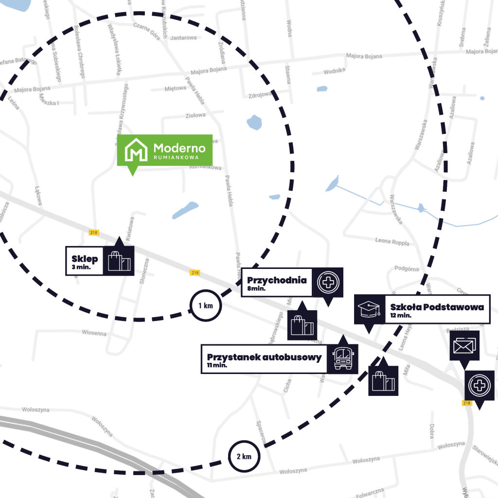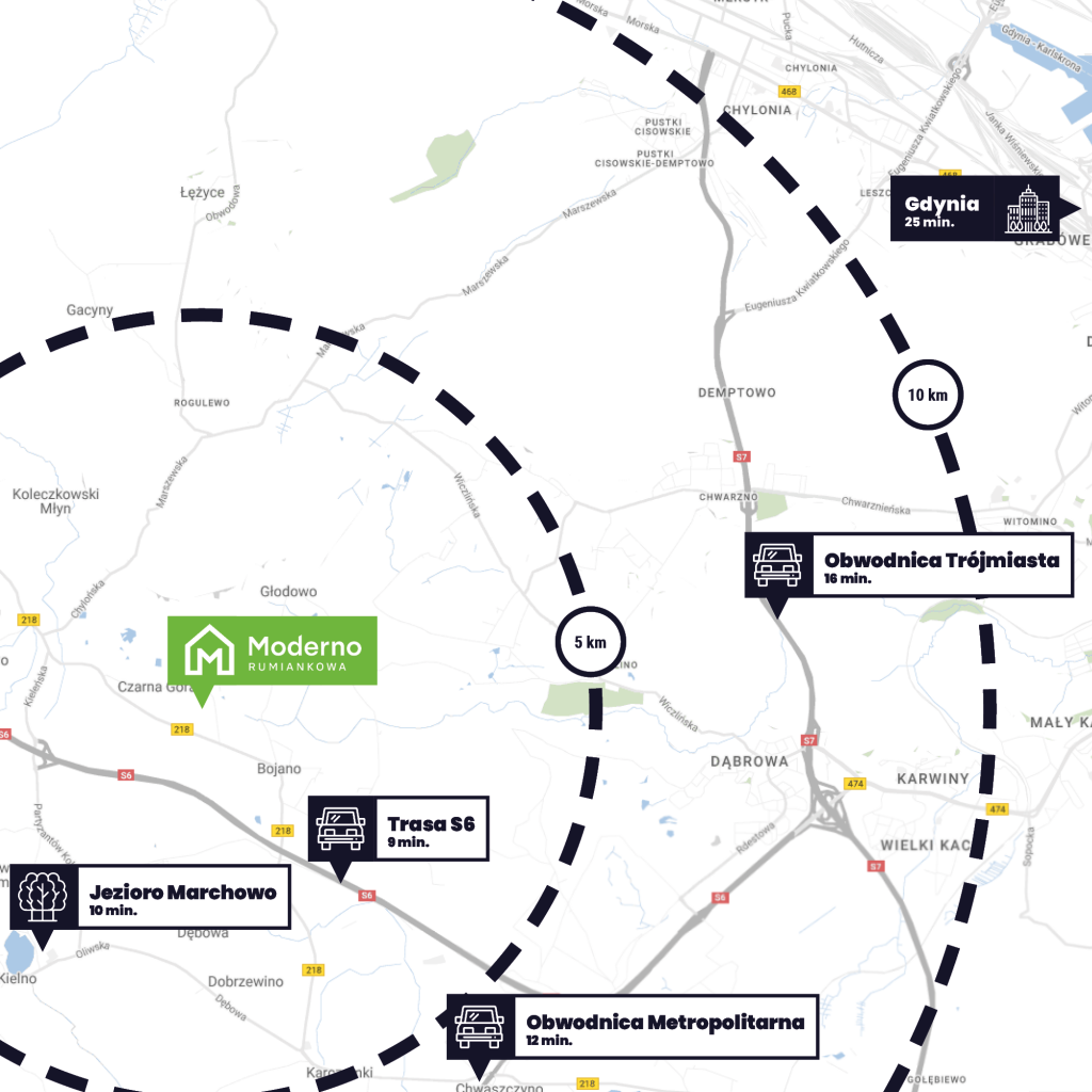 Moderno znajduje się przy ul. Rumiankowej w Bojanie. To spokojna enklawa, otoczona przede wszystkim zielenią oraz niską zabudową jednorodzinną. Inwestycja jest znakomicie skomunikowana – znajduje się blisko wjazdu na nową trasę S6 (7 min) oraz Obwodnicę Trójmiasta (10 min). Niedaleko również do nowo budowanej Obwodnicy Metropolitalnej. Dzięki temu do centrum Gdyni możesz dotrzeć samochodem w ok. 25 min.