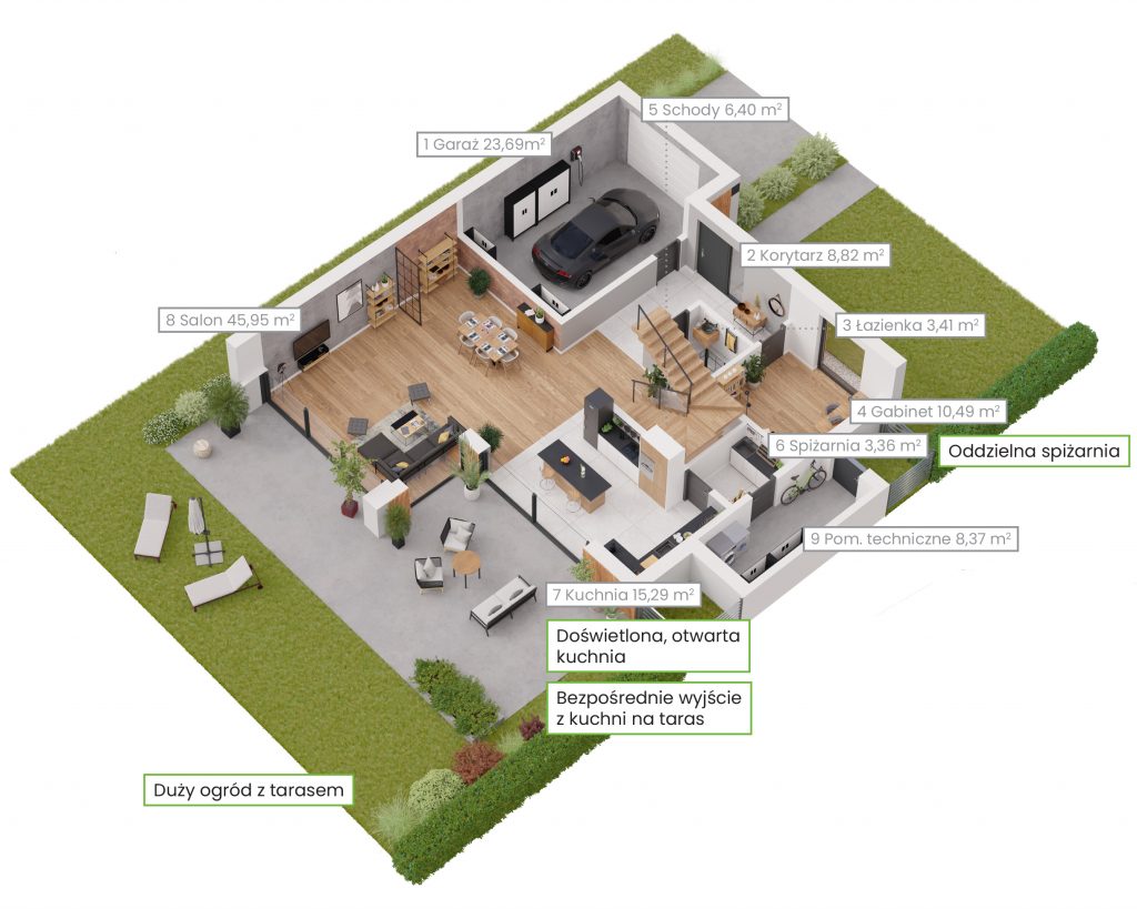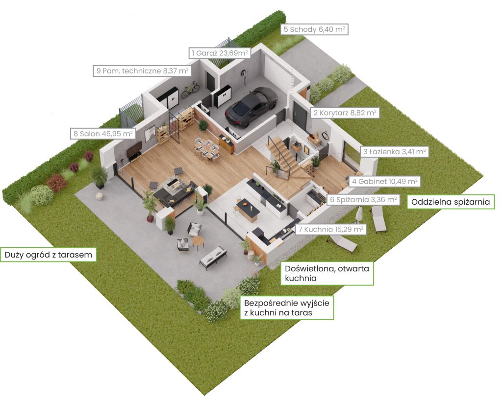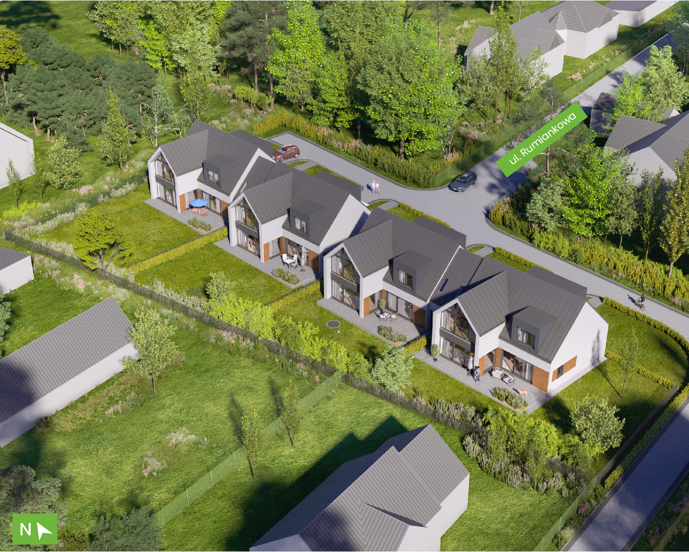 Zobacz okolicęModerno to kameralna inwestycja, obejmująca tylko 2 budynki w zabudowie bliźniaczej, czyli łącznie 4 domy. Do każdego z nich przynależy indywidualny ogród (działki o powierzchni od ok. 525 m² do ok. 718 m²) z tarasem od strony zachodniej, w którym możesz komfortowo wypoczywać na świeżym powietrzu – dostaniesz się do niego zarówno z salonu, jak i z kuchni.